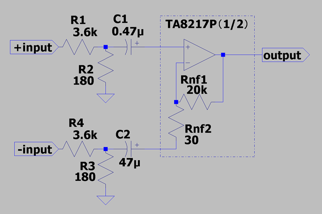 この手のアンプICはシングルエンド入力で使うのが標準だが、回路自体はたいてい差動入力である。