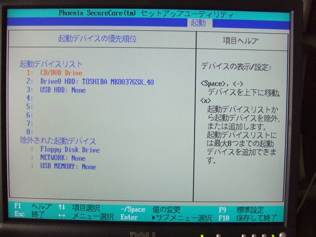 BIOS設定メニューを呼び出し、「USB-CD」のブート順位をHDDより上位に変更。