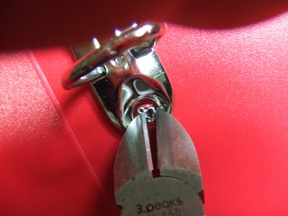 ハトメで2カ所留めてある。ニッパでつぶしてハトメを引き抜く。